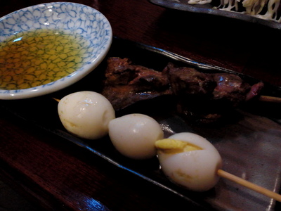 レバー。今回は鶏。大きい!パサパサせずに、とてもジューシー。ごま油でいただく。
