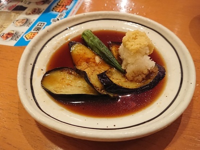 「揚げなすおろしポン酢(190円)」は、ナス薄い、量少ない、でも安いからいいかな?という感じ。