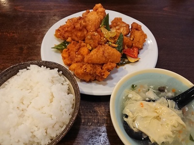 こちらは「鶏肉のスパイシー揚げ炒め(680円)」に、定食セット(199円)をつけたもの。