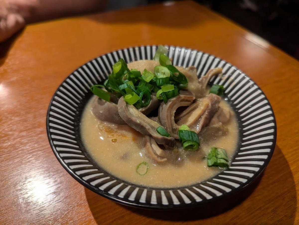 「ガツ味噌煮(280円)」は、甘めの味噌で柔らかくこってり煮込まれている。日本酒か焼酎に合いそうなのだが、