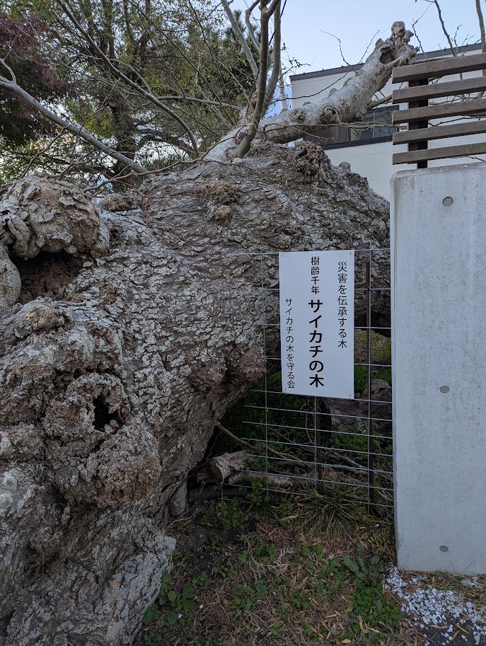 災害を伝承。樹齢千年ですって。